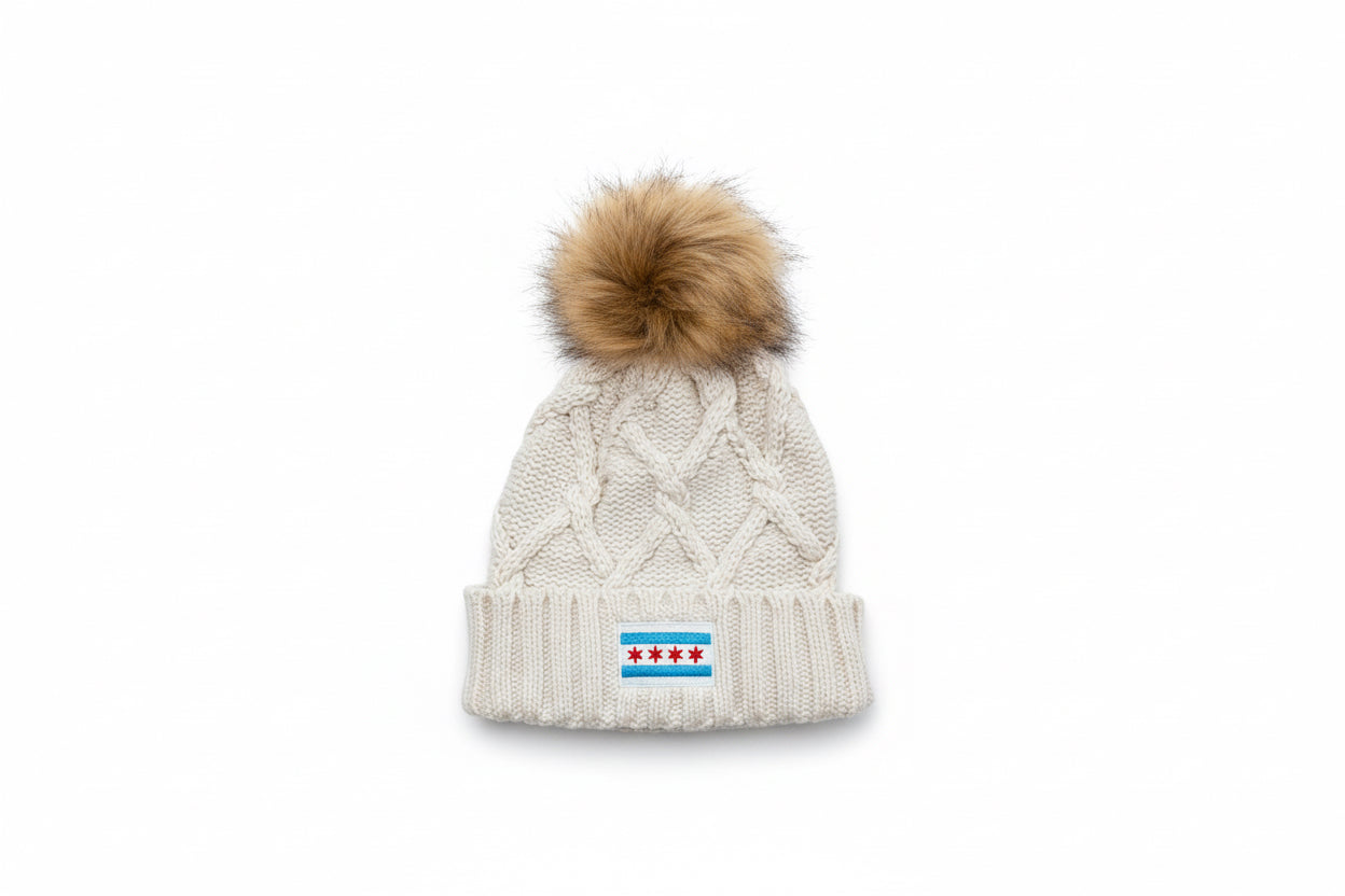 details: faux fur pom, cable knit design, embroidered chicago flag, youth and adult sizing, gray, ivory or navy blue.