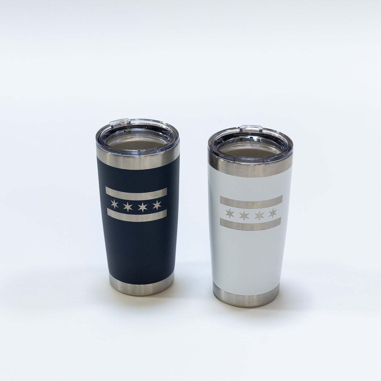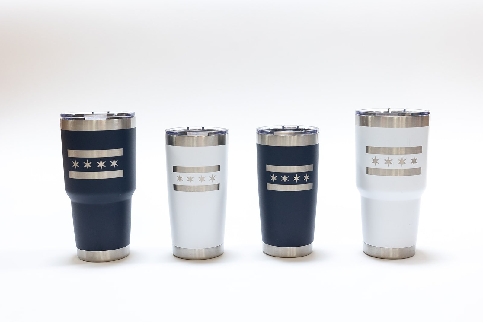 details: available in 20oz and 30oz sizes, double wall insulated, chicago flag design, keeps drinks hot or cold, stainless steel construction, shows your chicago pride.