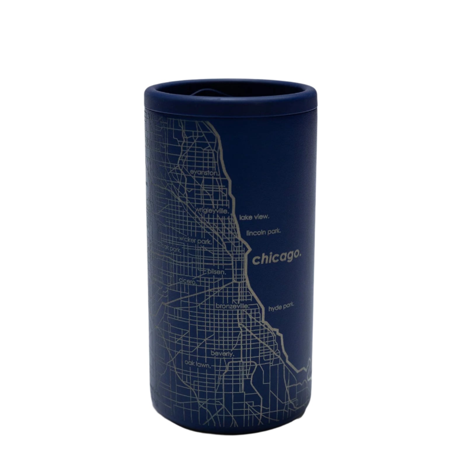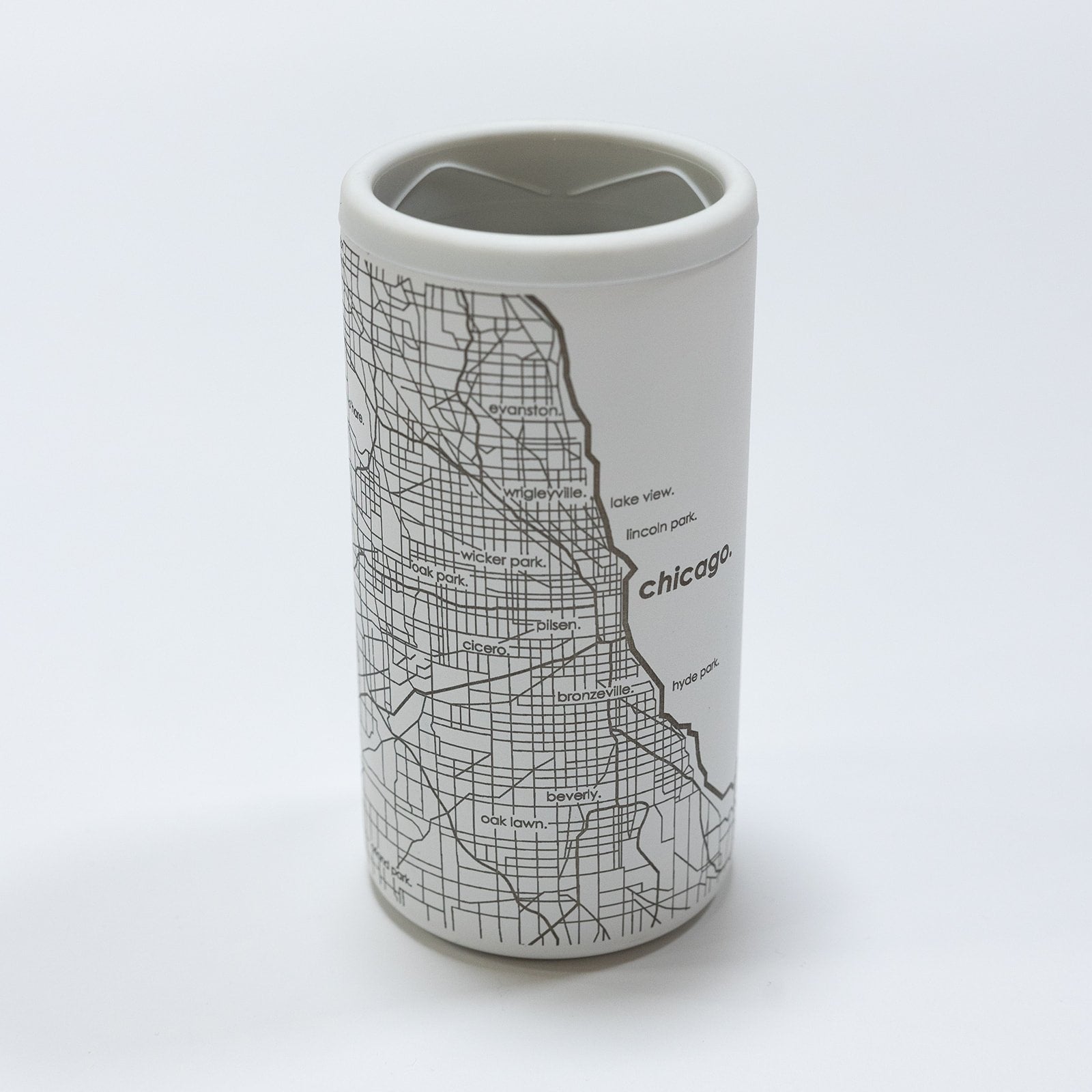 details: etched chicago map design, insulated to keep drinks cold, fits standard cans, durable construction, shows your chicago pride.