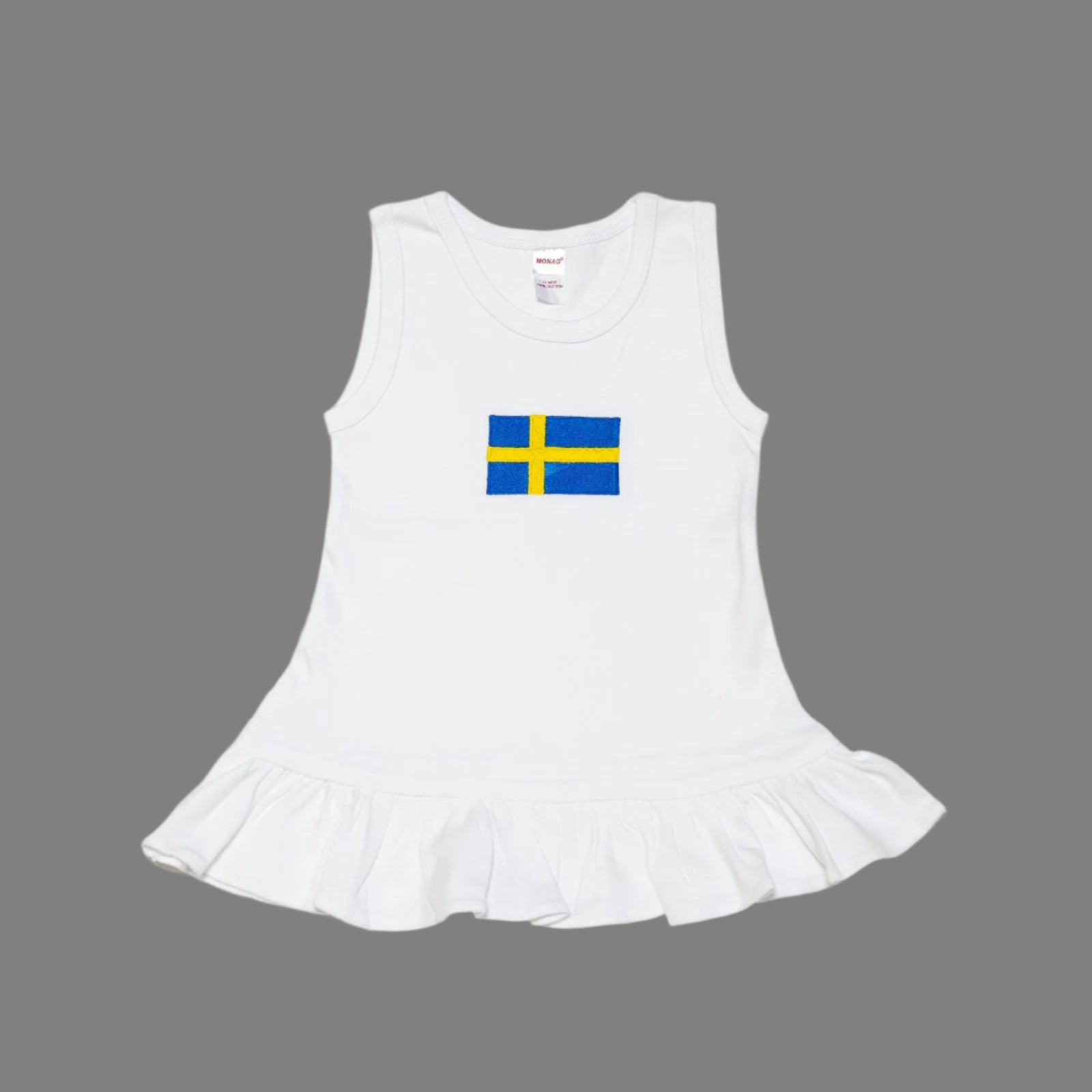 swedish flag dress, super soft, white sleeveless dress with sweet little ruffle at the hemline. great for baby gift, birthday gift, moving gift.