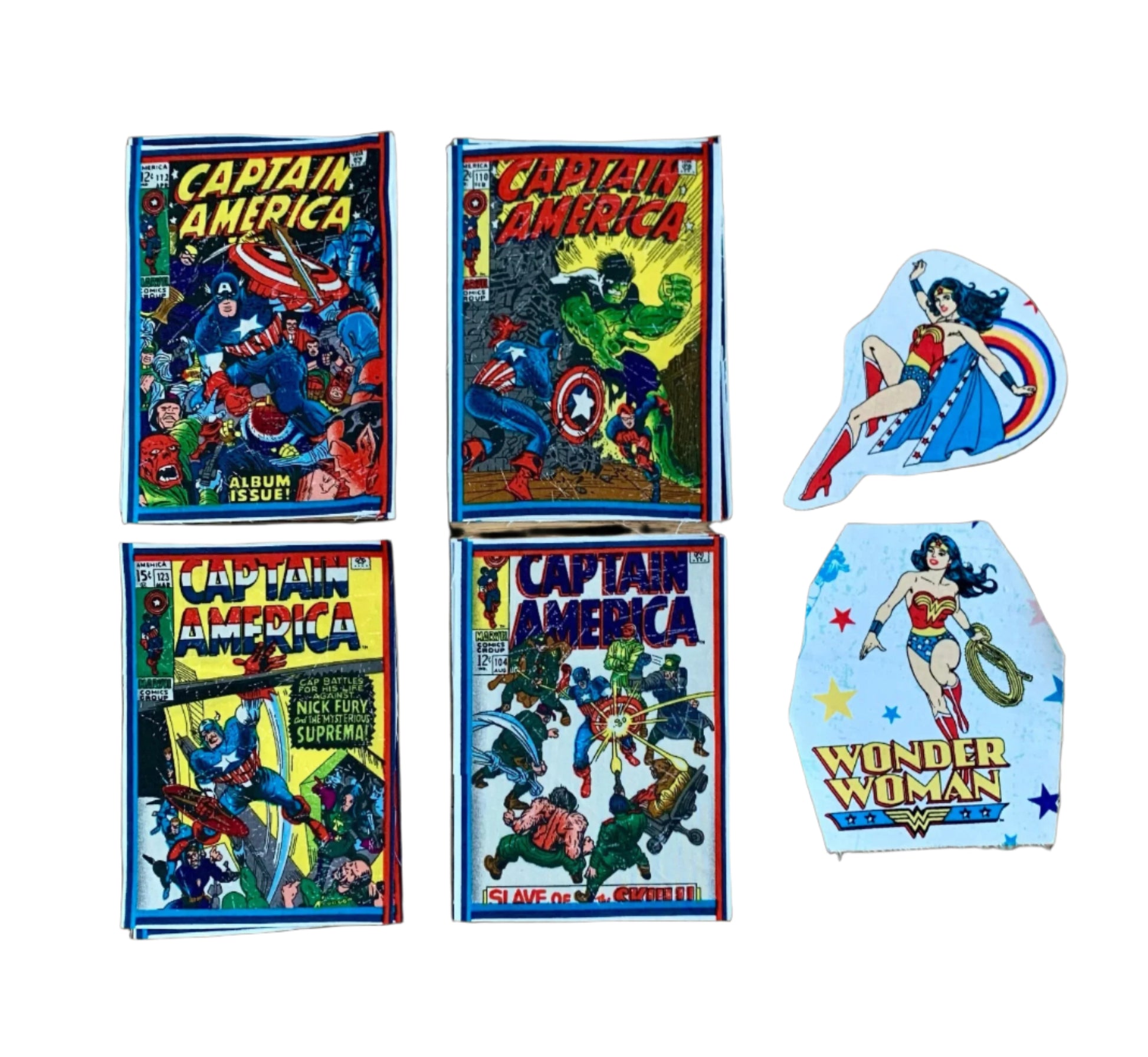 let your superhero imagine with these awesome wonder woman and captain america onesies and t-shirts! each piece features hand-cut fabric designs with iron-on backing, carefully sewn onto quality onesies and t-shirts.