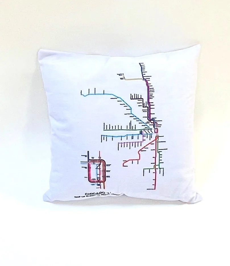 chicago loves it neighborhoods, this pillow has a chicago flag inspired map of all 77. this is a cover and insert. machine wash/dry